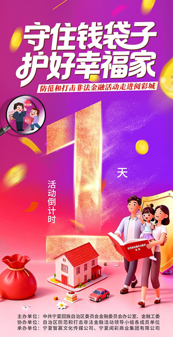 寧夏新聞網(wǎng)訊(記者 夏欣)由中共寧夏回族自治區(qū)委員會(huì)金融委員會(huì)辦公室、金融工委主辦,自治區(qū)防范和打擊非法金融活動(dòng)領(lǐng)導(dǎo)小組各成員單位協(xié)辦,寧夏智贏文化傳媒公司、寧夏閱彩商業(yè)集團(tuán)有限公司承辦的“守住錢袋子 護(hù)好幸福家——防范和打擊非法金融活動(dòng)走進(jìn)閱彩城”主題宣傳活動(dòng),將于12月11日14:30在銀川閱彩城負(fù)一層廣場(chǎng)正式啟動(dòng)!