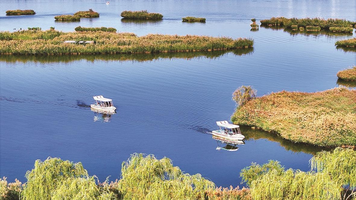 閱海湖似那秋日里動人的眼眸。湖水澄澈如藍(lán)寶石,倒映著黛青色的賀蘭山巒,山與水在光影中交織成層次分明的畫卷。蘆葦叢在湖中搖曳生姿,似在與秋風(fēng)共跳一支華爾茲。