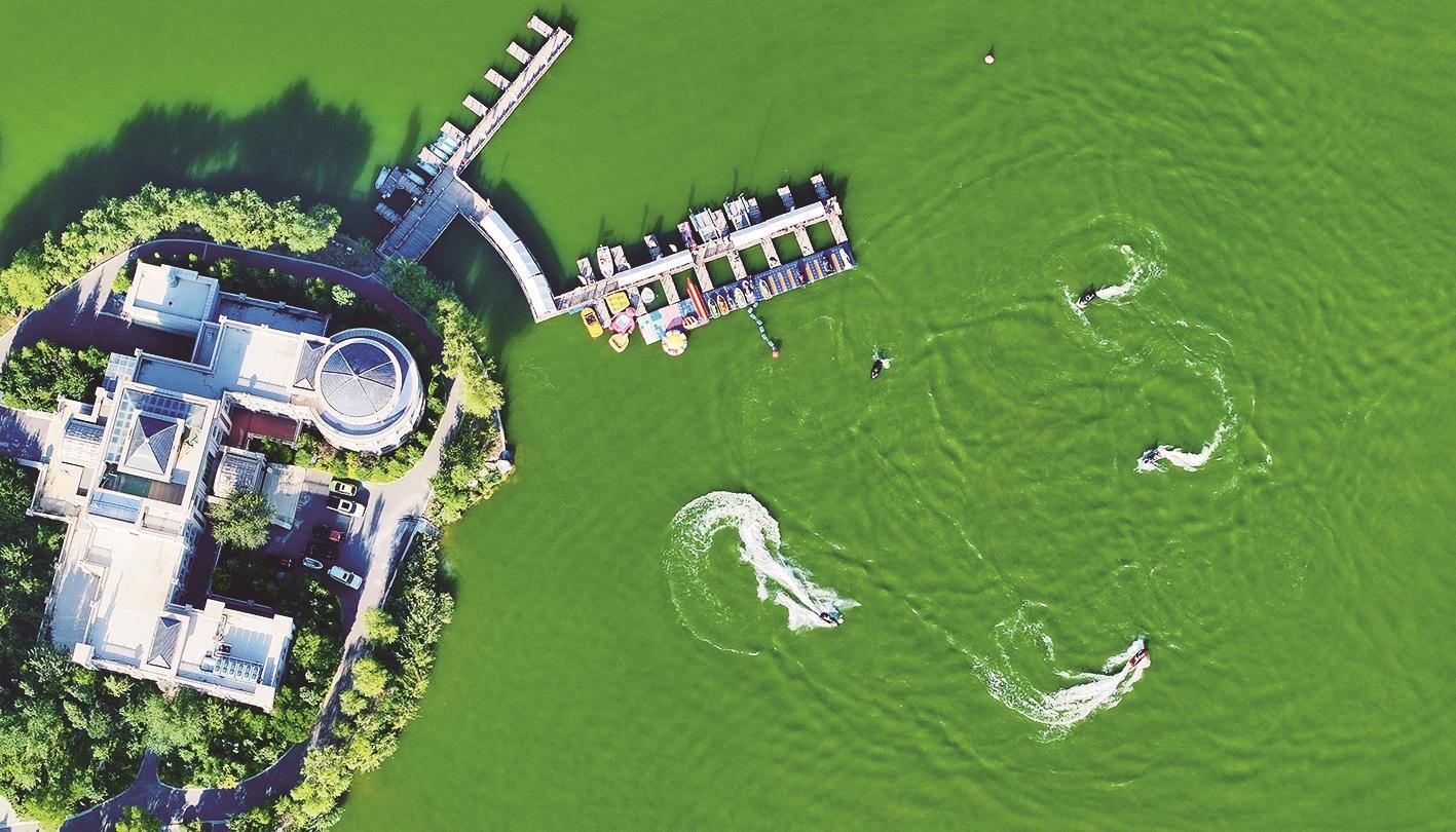 快艇在閱海湖里風(fēng)馳電掣,似靈動游龍穿梭于湖光山色間。