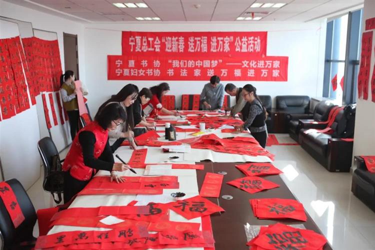 萬里晴空風(fēng)和煦,春風(fēng)送暖福臨門。1月14日下午,自治區(qū)總工會機(jī)關(guān)舉辦首場“迎新春 送萬福 進(jìn)萬家”公益活動(dòng),有幸邀請到寧夏婦女書法家協(xié)會主席喬華以及趙萍、趙彥、蘇詠梅、何軍菁等6名書法家現(xiàn)場創(chuàng)作對聯(lián)等書法作品500份。一個(gè)個(gè)厚實(shí)飽滿的“?!弊帧⒁桓备睔忭嵣鷦?dòng)的春聯(lián),寄托著對新的一年美好的期盼和祝福,讓大家在感受喜慶的同時(shí)還體會到了中國書法的傳統(tǒng)文化魅力,濃濃的新年氣息撲面而來。
