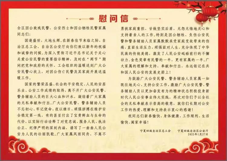 自治區(qū)總工會(huì)將繼續(xù)加強(qiáng)與自治區(qū)公安廳的協(xié)調(diào)對(duì)接,進(jìn)一步完善公安民警困難幫扶慰問(wèn)等工作機(jī)制,努力做好關(guān)心關(guān)愛(ài)公安民警特別是公安烈士、因公犧牲家屬和因公傷殘公安民警工作,為建設(shè)平安寧夏貢獻(xiàn)工會(huì)力量。