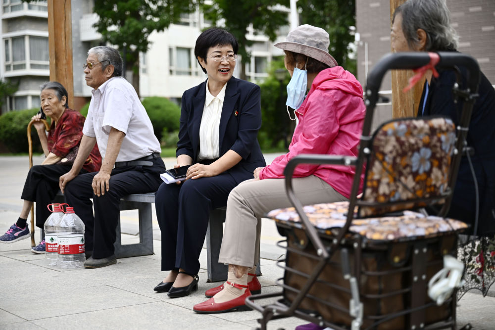 ??6月20日,寧夏銀川市金鳳區(qū)長(zhǎng)城花園社區(qū)黨委書(shū)記趙耐香(左三)在社區(qū)廣場(chǎng)與居民交流。