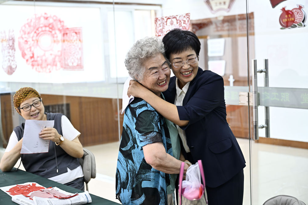 ??6月20日,寧夏銀川市金鳳區(qū)長(zhǎng)城花園社區(qū)黨委書(shū)記趙耐香(右一)在社區(qū)“才藝堂”與居民交流。