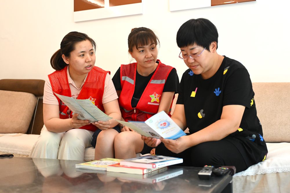 ??6月20日,寧夏銀川市金鳳區(qū)長(zhǎng)城花園社區(qū)志愿者在入戶為居民提供服務(wù)。